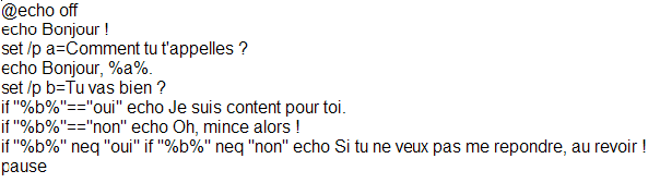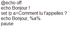 "@echo off"empêche de voir ce qui est inutile. "echo"affiche le message qui le suit à l'écran. "set /p" demande une réponse. "%a%" est la réponse. "pause" affiche la dernière ligne.
