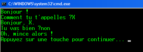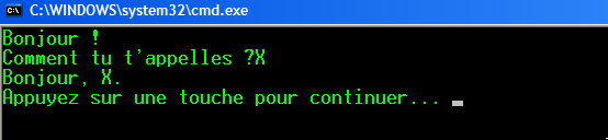 Pour cela, tapez "set /p" suivi de "n'importe quoi, en fait!" suivi de "=" suivi de, par exemple, la question que vous désirez poser.