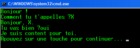 Dans ce cas l'utilisateur répond "oui" donc on lui dit "Je suis content pour toi".