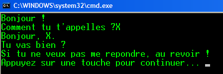 Dans ce cas l'utilisateur du programme ne répond pas (en appuyant directement sur la touche entrée), mais cela marche aussi si l'on met autre chose que "oui" ou "non", et on lui dit "Si tu ne veux pas me répondre, au revoir !".