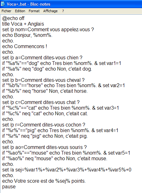 Remarque : Quand vous utilisez la commande "set /a" mettez à la fin de l'addition (ou soustraction, multiplication, ...) "+0" car si toutes les variables ne prennent pas une valeur positive (si l'utilisateur répond mal partout, par exemple), le résultat n'aura pas de valeur.