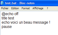 La première commande à savoir est "echo". Vous tapez cette commande au début d'une ligne suivi de ce que vous voulez écrire, et, lors de l'éxécution du programme, ce qui suit cette commande sera affiché en tant que mesage.